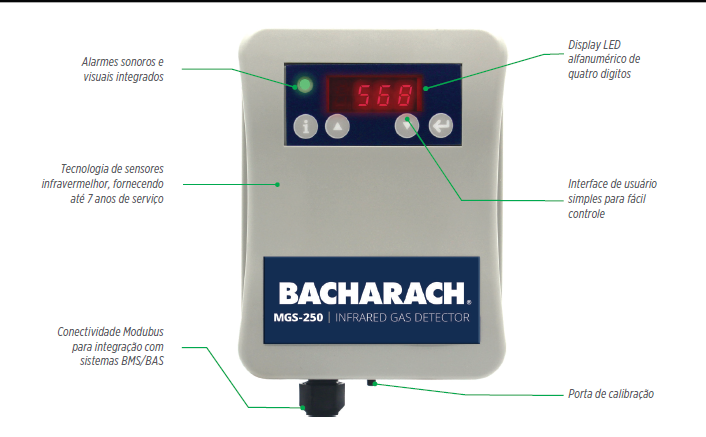O detector de gás MGS-250 da MSA Bacharach é uma solução eficaz para a conformidade com os códigos de segurança de refrigeração (ASHRAE 15/34, EN378* e CSA-B52) e padrões de redução de emissões (EPA 608/CARB e F-Gas). O sensor infravermelho proprietário de longa duração (NDIR) fornece até 7 anos de serviço sem manutenção, detectando a presença de um gás alvo até 10 ppm de Nível Mínimo de Detecção (MDL) O sensor não é propenso a alarmes falsos causados por interferência cruzada de outros gases ou mudanças repentinas de temperatura ou umidade. O visor LED de 4 dígitos mostra as leituras de concentração em tempo real e torna a configuração e o autodiagnóstico intuitivos. Saída analógica configurável (4-20mA, 0-5V, 0-10V, 1-5V ou 2-10V) e comunicações Modbus para integração com o controlador MGS-408 da Bacharach ou sistemas de controle BMS / BAS de terceiros O relé configurável pelo usuário (alarme) pode ser usado para ativar balizas / sirenes externas, ventilação ou outras contramedidas Possui alarmes sonoros / visuais integrados para conformidade de segurança de refrigeração - sem hardware adicional Conformidade com CARB atingida a 10 ppm MDL e 100 ppm alarmante.